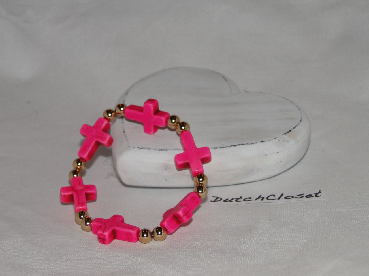 Goudkleurige kralen met roze keramieke kruizen