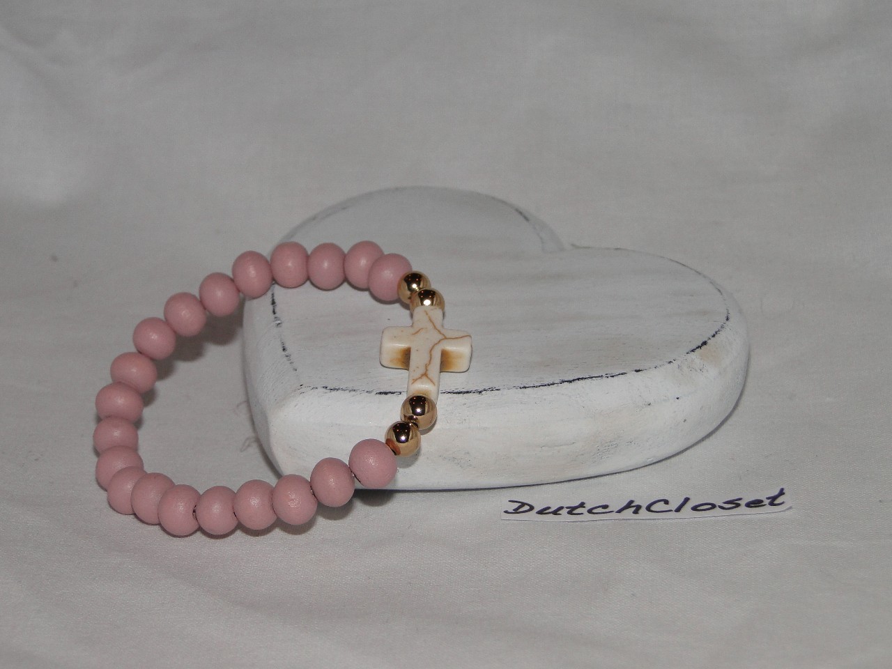 Oud roze en goudkleurige kralen met wit keramiek kruis