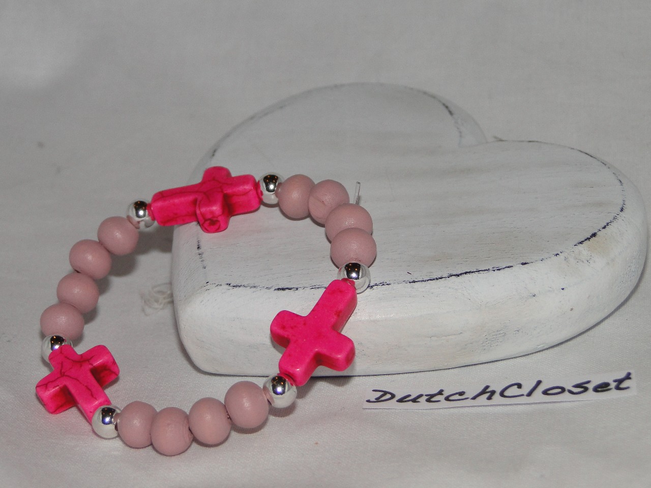 Oud roze en zilveren kralen met roze keramieke kruizen