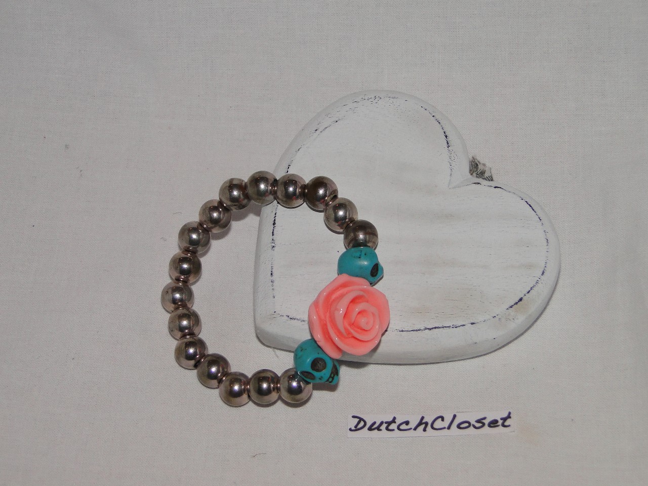 Zilveren kralen met blauwe skulls en roze roos